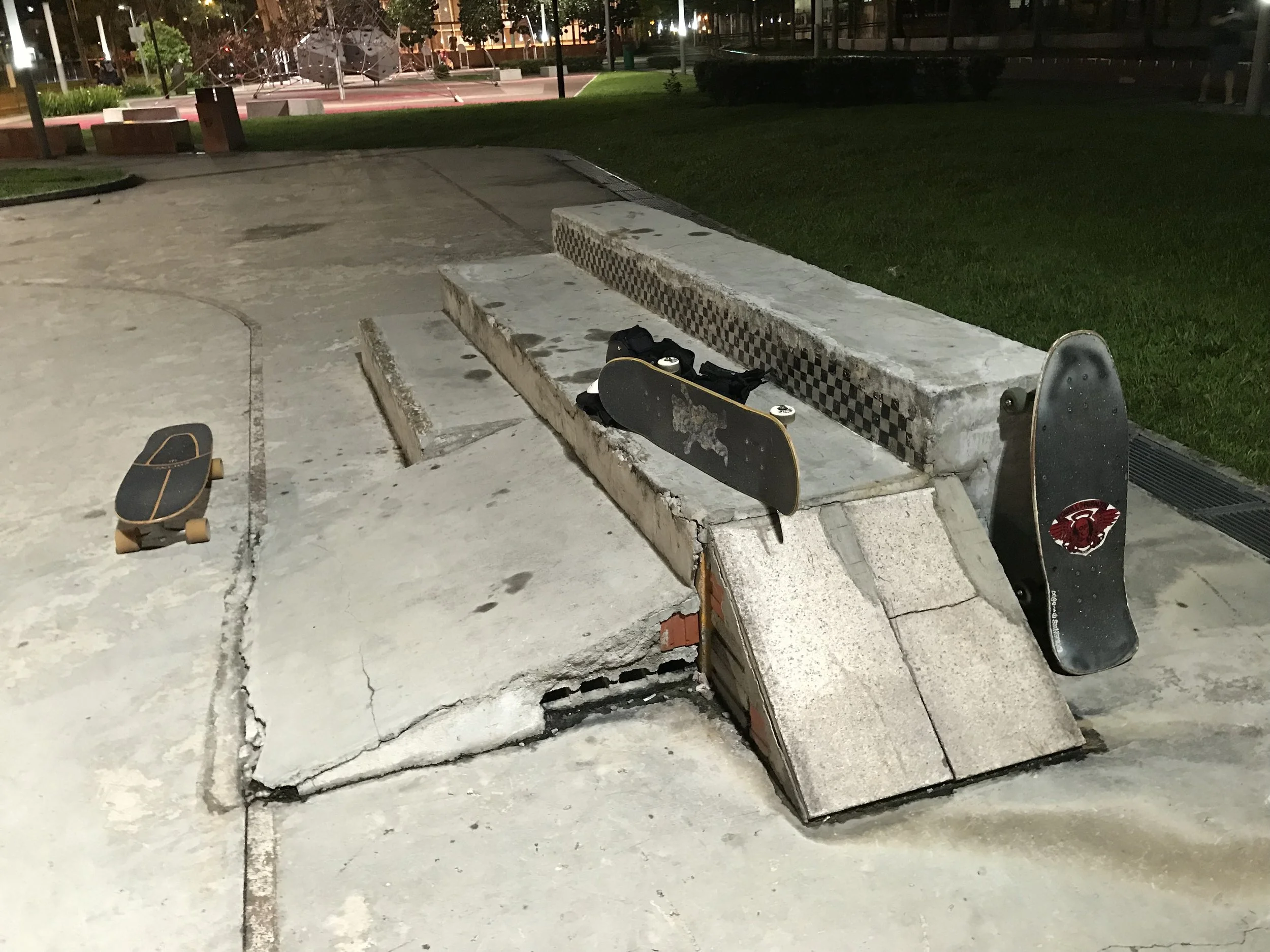 Here's another weird skatepark, but surprisingly quite fun for learning beginner tricks. The strange cement volcano is about 2 feet high, so learning drop ins here is good :)